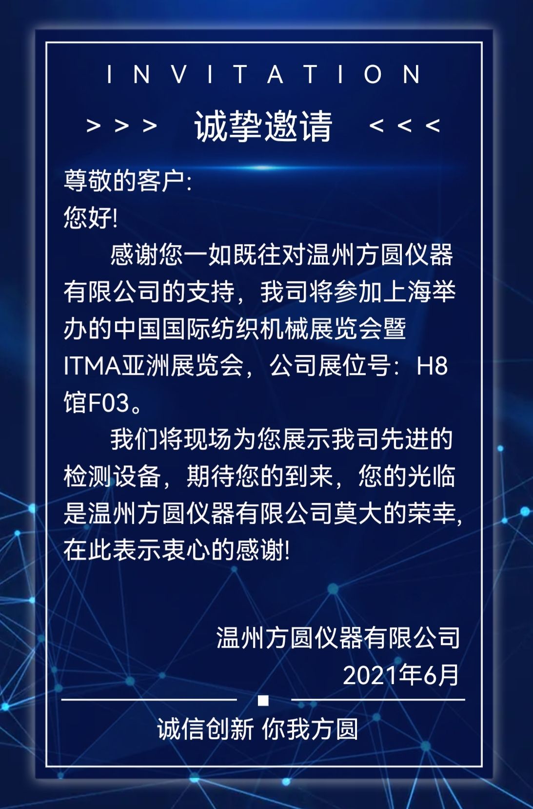 感謝您一如既往對(duì)溫州方圓儀器有限公司的支持,我司將參加上海舉辦的中國(guó)國(guó)際紡織機(jī)械展覽會(huì)暨ITMA亞洲展覽會(huì),公司展位號(hào):H8館F03。